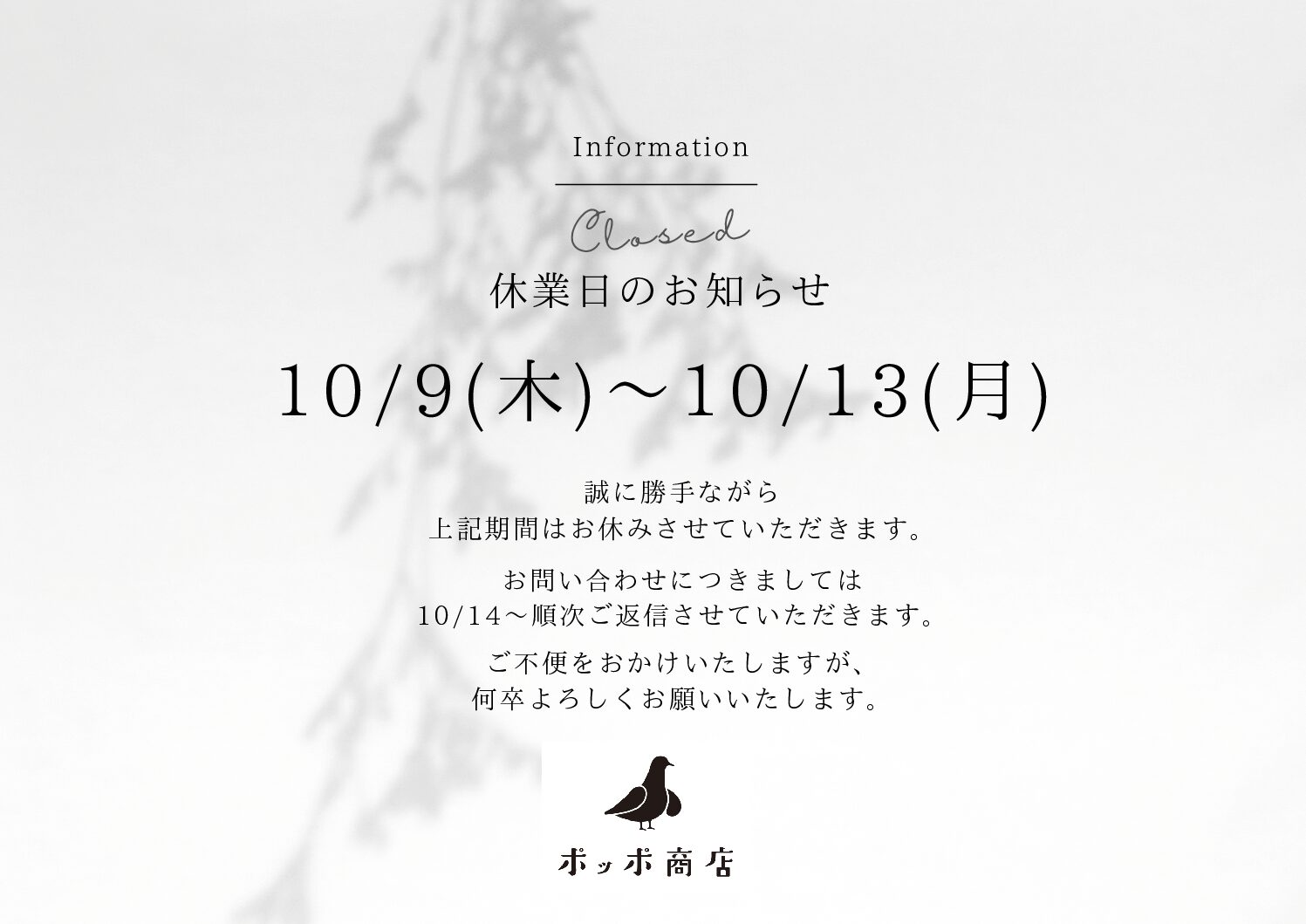 誠に勝手ながら、 10月9日(木)〜13日(月)まで、 お休みとさせていただきます。